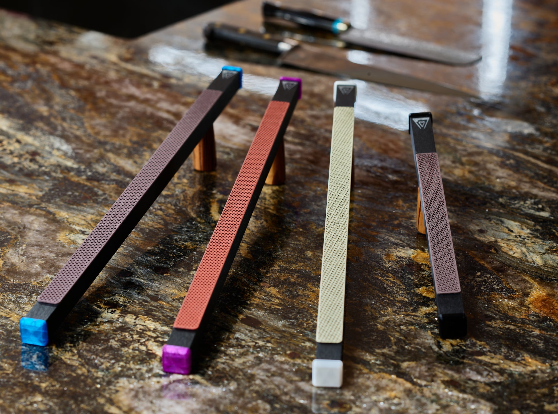 Our Nano Strop is designed for long sharpening strokes. This means fewer transitions and more angle control. Use it like a barber's razor strop. It has a very low (distributed) point load; this will keep the fare curve of your edges from deforming over time.