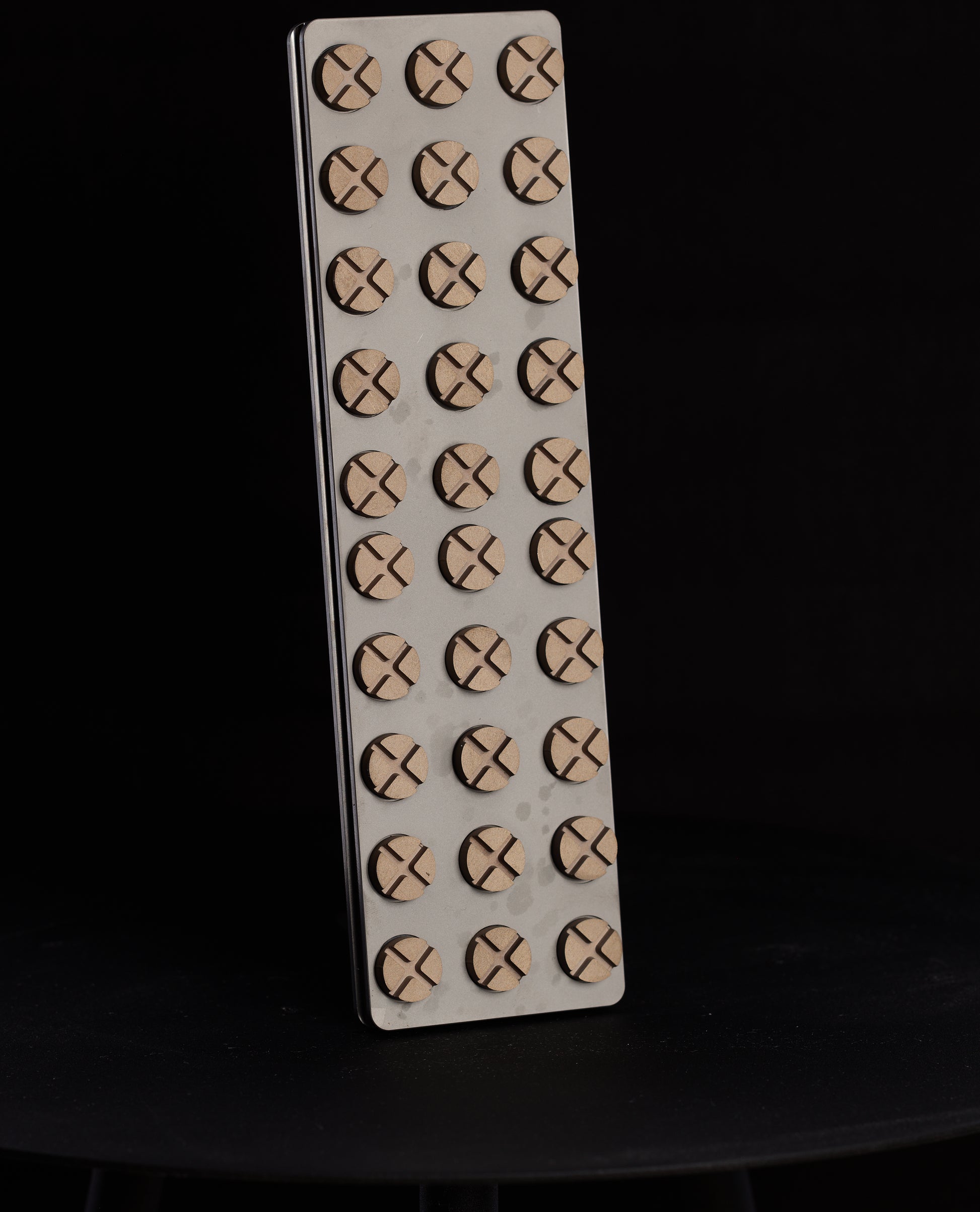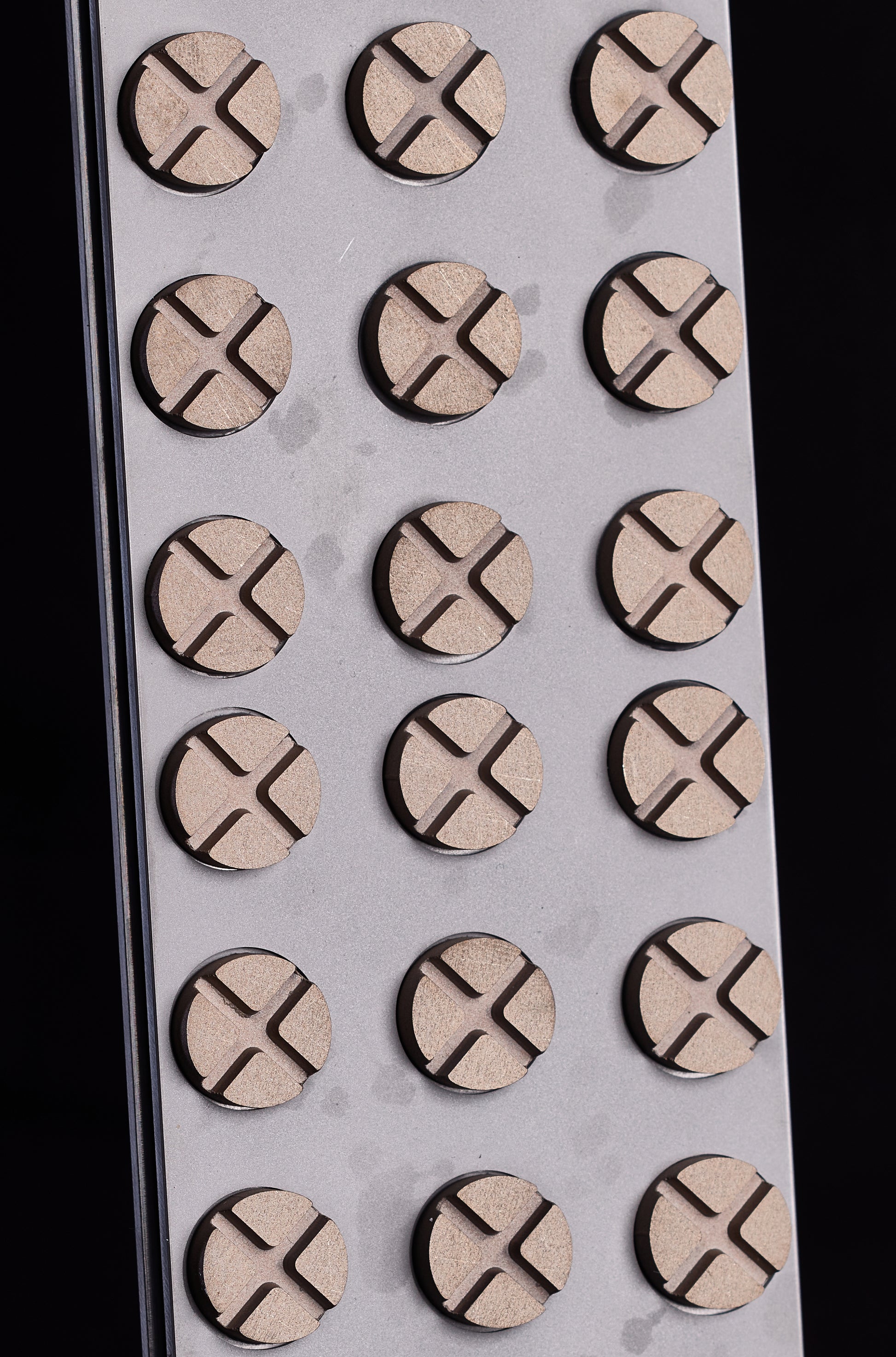 Diamonds are dispersed evenly throughout the metal button matrix. This design is extraordinarily tough. The buttons have been set in stainless steel weighs to ensure structural integrity. These buttons are extraordinarily durable. The button plate is an amazing surface leveling tool. Its weight is integral to its smooth lapping action.