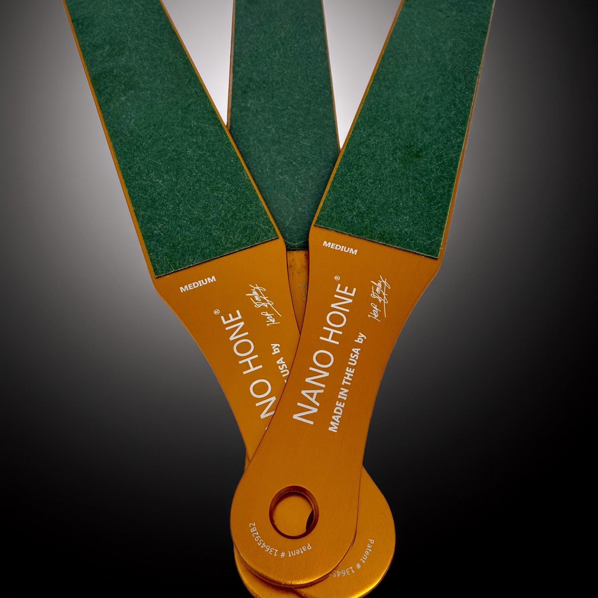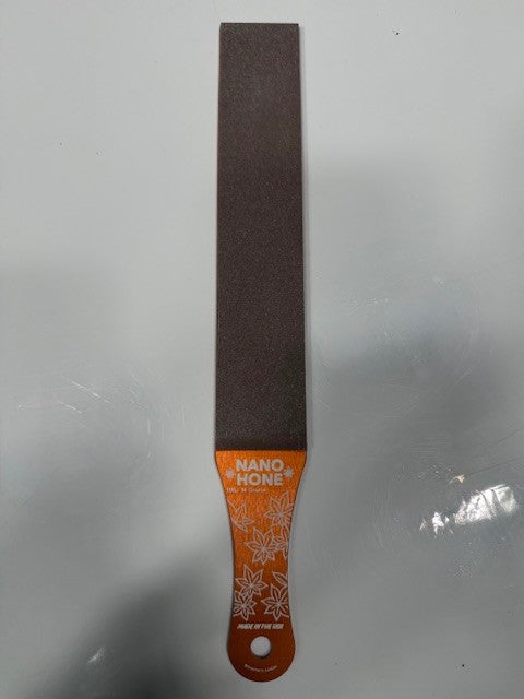 NANO HONE TRUER is an edge maintenance tool. Hap designed it to be light, portable and powerful. We are offering it in a 50 micron x 3 micron configuration labeled "MEDIUM" and "FINE". This is a perfect tool for maintaining a razor sharp edge on pocket knives, hunting knives and cooking knives. It can be used with a couple of drops of water, dry or with a light oil (we recommend Camilla Oil). The medium side will leave a slight tooth and the fine side will be shaving sharp. Hang it on your wall, pop it in your knife roll or even your chefs coat pocket. Use this tool to maintain your edges using trailing edge strokes. Use it like spreading butter. Just drag your edge over the NANO HONE diamond resin and expect eye popping results.